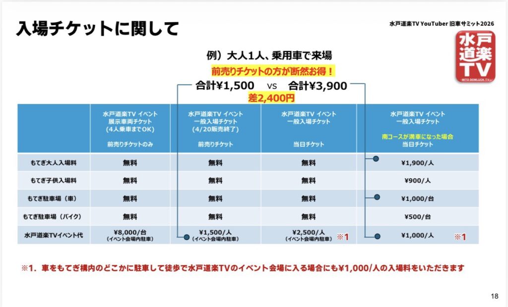 - 今回のイベントは水戸道楽で、モビリティリゾートもてぎの入場料金を負担する形で行っております。事前受付せずに直接来場された場合は料金体系が変わりますのでご了承ください。